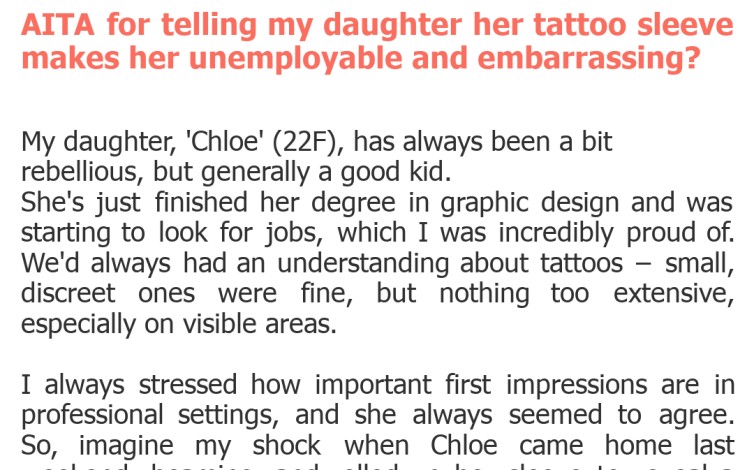 "AITA for telling my daughter her tattoo sleeve makes her unemployable and embarrassing?"