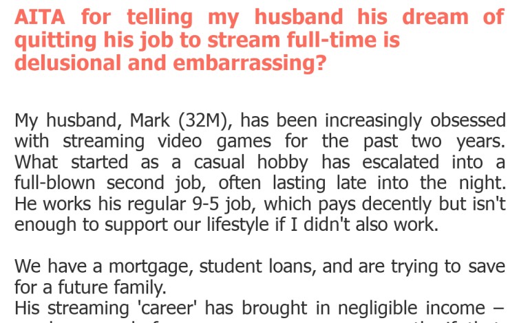 "AITA for telling my husband his dream of quitting his job to stream full-time is delusional and embarrassing?"