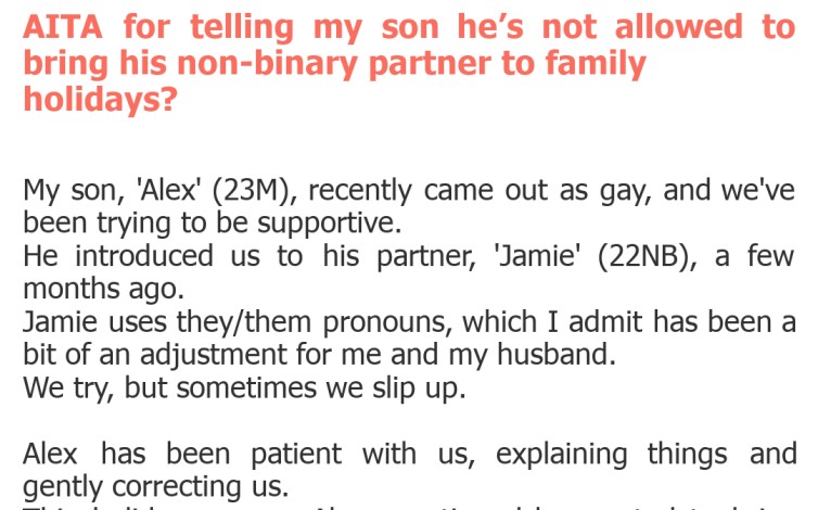 "AITA for telling my son he’s not allowed to bring his non-binary partner to family holidays?"