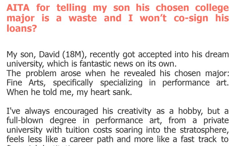 This scenario is a tightrope walk between a parent's desire to protect their child's future and a child's right to pursue their passions. The OP's concerns about the financial viability of a performance art degree, especially at a costly private university, are undeniably valid. Student loan debt is a significant burden for many, and a parent's reluctance to co-sign when they perceive a high risk of poor return on investment is understandable from a pragmatic standpoint. \n However, the way this message was delivered, specifically labeling his son's chosen major as 'a waste,' could be incredibly damaging. This kind of language can crush a young person's spirit and make them feel unsupported in their deepest aspirations. While financial caution is wise, dismissing a child's dream outright can lead to resentment and a permanent rift in the relationship, overshadowing any good intentions. \n It's also important to consider the son's perspective. At 18, many young adults are still figuring out their path. They might genuinely believe in the value of their chosen field, even if the job market is challenging. Having a parent immediately shut down that dream, rather than exploring alternatives or compromises, can feel like a betrayal. His happiness and sense of purpose are at stake. \n Ultimately, there's a need for a more nuanced conversation. Instead of an outright dismissal, perhaps the OP could have explored options like scholarships, state schools with lower tuition, or a conversation about how a Fine Arts degree can be leveraged creatively in various fields, even if not directly in performance. Communication is key, especially when dealing with such sensitive and future-defining decisions.