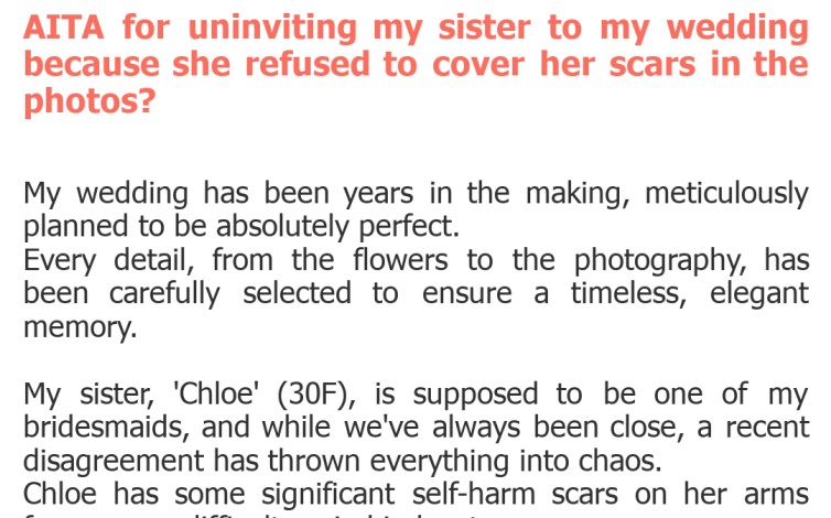 "AITA for uninviting my sister to my wedding because she refused to cover her scars in the photos?"