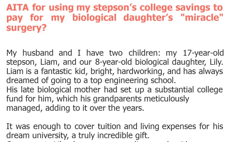 AITA for using my stepson’s college savings to pay for my biological daughter’s “miracle” surgery?