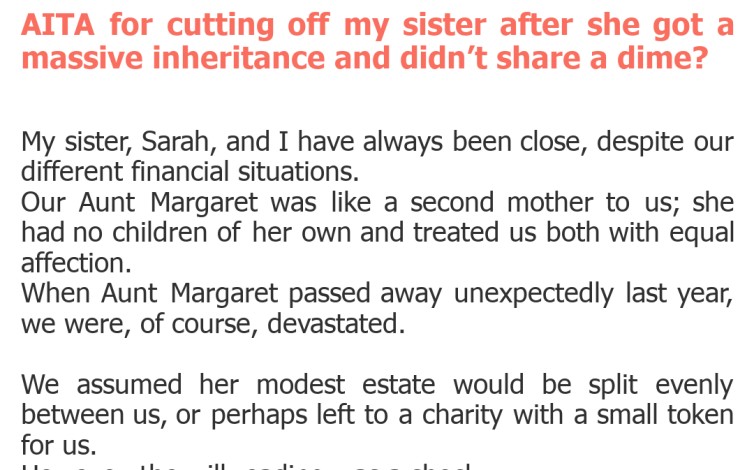 "AITA for cutting off my sister after she got a massive inheritance and didn’t share a dime?"