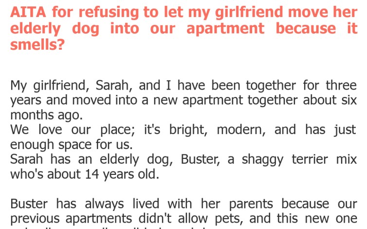 "AITA for refusing to let my girlfriend move her elderly dog into our apartment because it smells?"