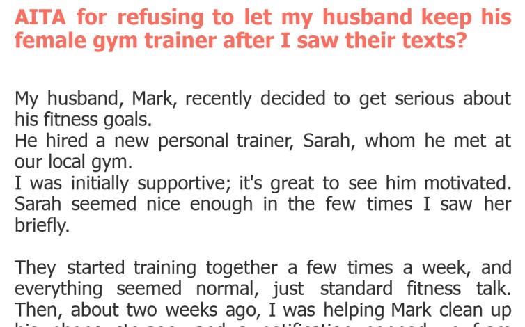 "AITA for refusing to let my husband keep his female gym trainer after I saw their texts?"