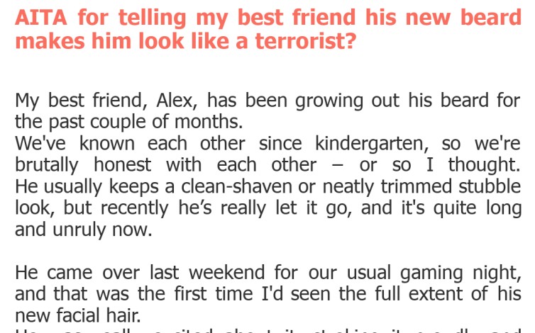 "AITA for telling my best friend his new beard makes him look like a terrorist?"