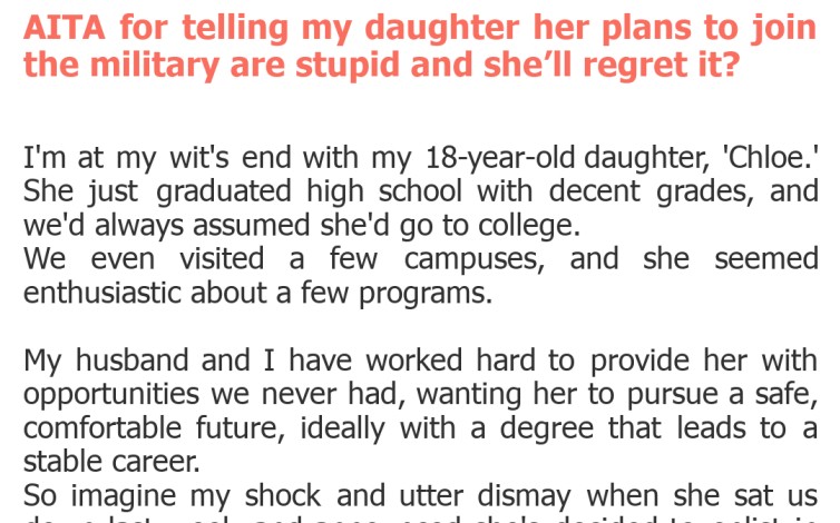 "AITA for telling my daughter her plans to join the military are stupid and she’ll regret it?"