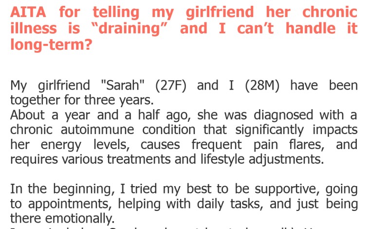 "AITA for telling my girlfriend her chronic illness is “draining” and I can’t handle it long-term?"