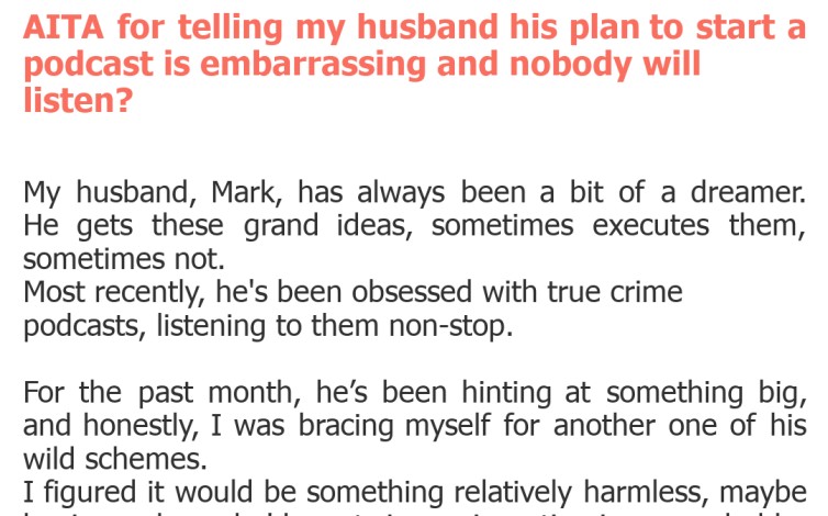 "AITA for telling my husband his plan to start a podcast is embarrassing and nobody will listen?"
