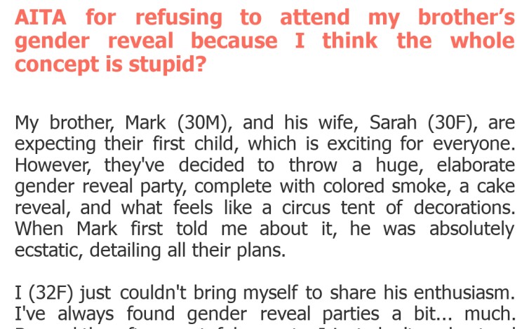 Our OP finds themselves in a sticky situation, having drawn a firm line in the sand regarding their attendance at their brother's upcoming gender reveal. Is it a matter of standing firm on principle, or is it a moment to put family harmony first, even if it means enduring an event one finds "stupid"? Let's unpack this familial dilemma together.