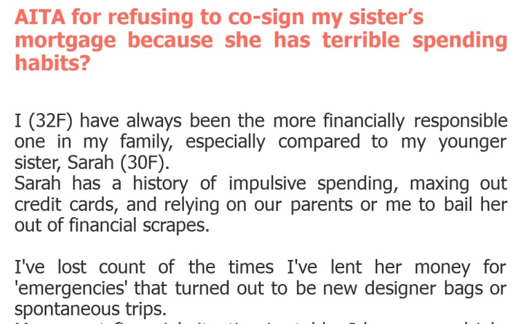 "AITA for refusing to co-sign my sister’s mortgage because she has terrible spending habits?"
