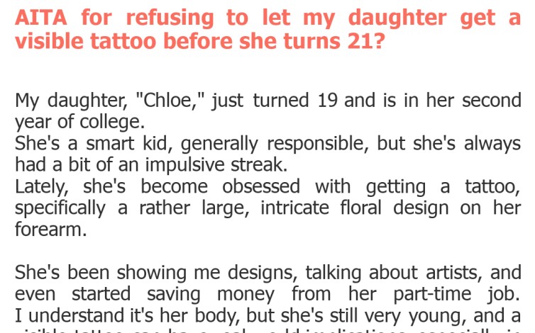This AITA case highlights the enduring challenge of balancing parental guidance with a young adult's autonomy. While the legal age of adulthood grants certain rights, the emotional and practical implications of permanent decisions like tattoos often fall into a grey area for families. Open communication, empathy, and perhaps exploring compromises rather than strict prohibitions, might be the key to navigating these sensitive discussions without fracturing the parent-child bond. Ultimately, both sides usually want what they believe is best, just with different definitions of "best."