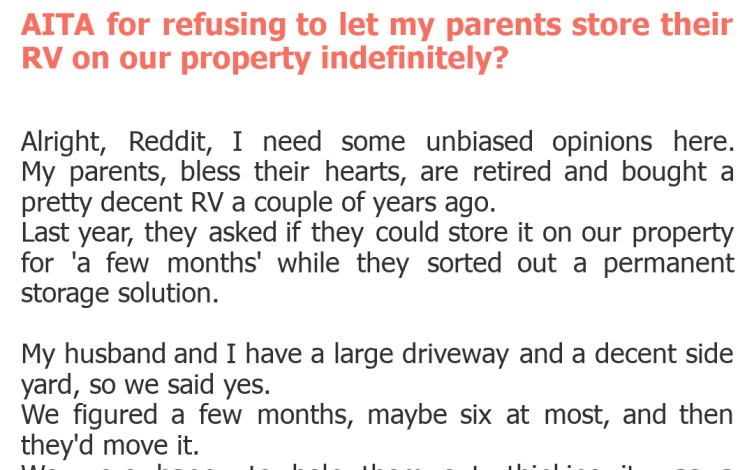 "AITA for refusing to let my parents store their RV on our property indefinitely?"