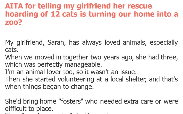 "AITA for telling my girlfriend her rescue hoarding of 12 cats is turning our home into a zoo?"