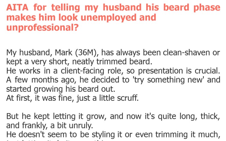 "AITA for telling my husband his beard phase makes him look unemployed and unprofessional?"