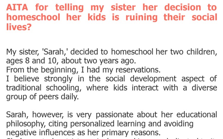 "AITA for telling my sister her decision to homeschool her kids is ruining their social lives?"