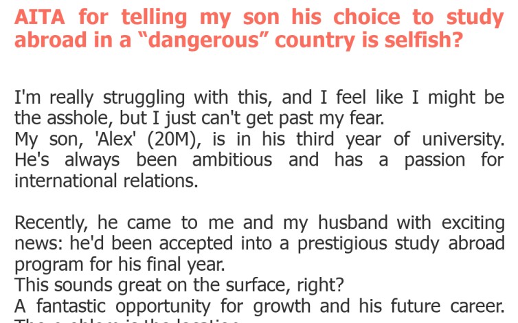 "AITA for telling my son his choice to study abroad in a “dangerous” country is selfish?"