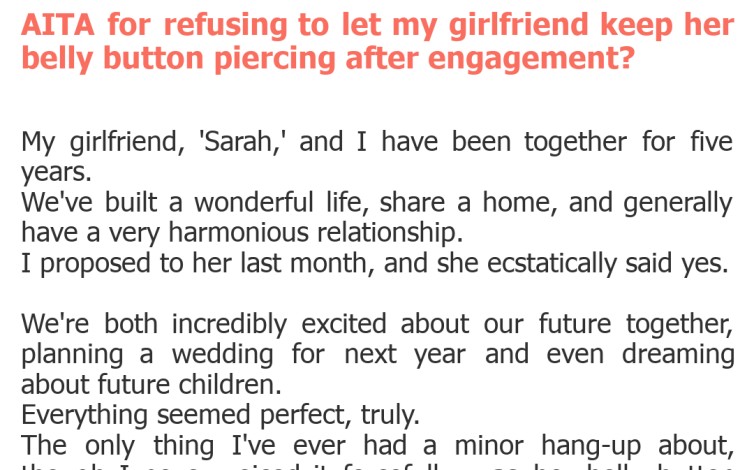 "AITA for refusing to let my girlfriend keep her belly button piercing after engagement?"