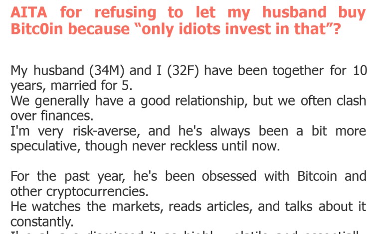 "AITA for refusing to let my husband buy Bitc0in because “only idiots invest in that”?"