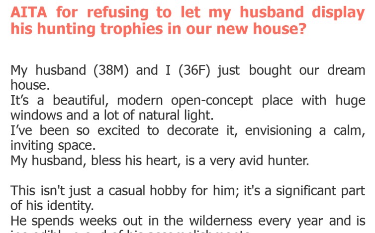 "AITA for refusing to let my husband display his hunting trophies in our new house?"