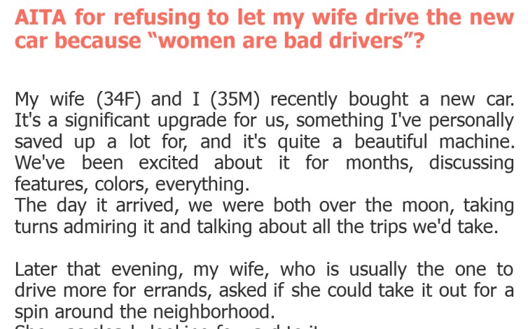 "AITA for refusing to let my wife drive the new car because “women are bad drivers”?"