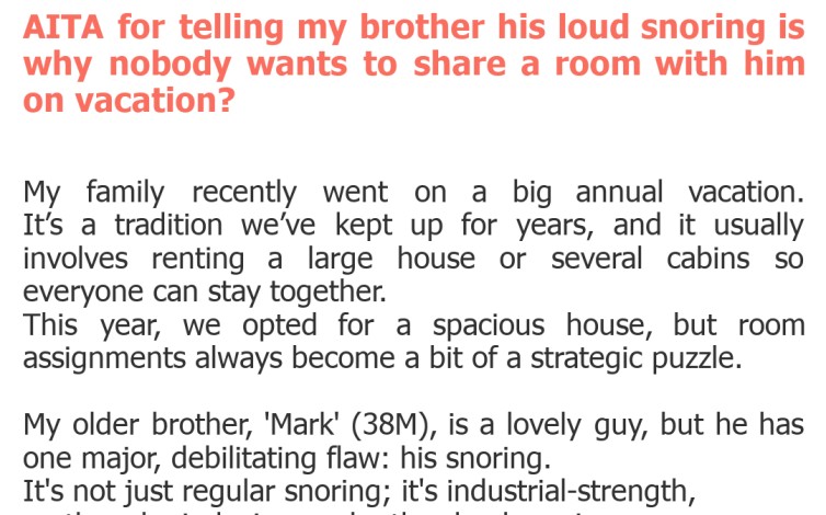 "AITA for telling my brother his loud snoring is why nobody wants to share a room with him on vacation?"