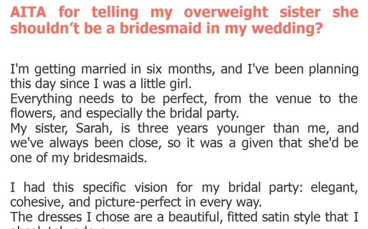 "AITA for telling my overweight sister she shouldn’t be a bridesmaid in my wedding?"