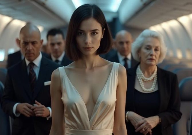 Inside the plane, she dropped into seat 1A, kicking off her shoes and blocking the aisle. She accepted champagne without looking at the attendant.