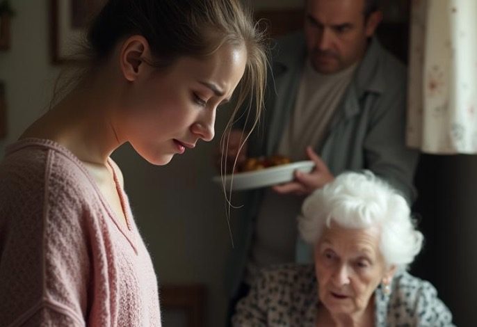 She wasn’t eating. She was standing at the sink, her back hunched in a posture of permanent apology. The sleeves of her oversized sweater were pushed up, revealing arms that looked too thin. She was scrubbing a roasting pan with a ferocity that spoke of fear, not cleanliness.