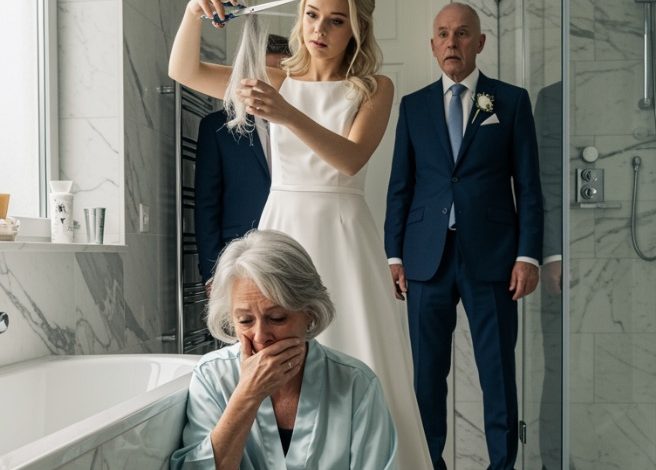 On the wedding morning, i opened the bathroom door and saw my wife frozen before the mirror, her silver hair cut away—while my daughter-in-law laughed on camera, calling it a “prank.” i stayed silent until the consequences came… and she began to tremble…