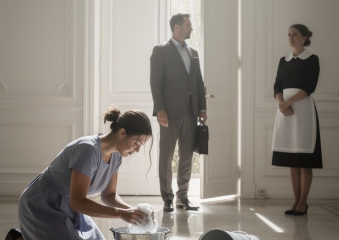 Beyond her, in the adjoining sitting room, sat Eleanor Price, our house manager, her legs crossed in my favorite leather chair, a porcelain cup balanced on her knee, while another staff member laughed softly at something on the television, their posture relaxed, their attention distant, as if the woman scrubbing the floor five feet away was not the owner of the house but an inconvenience to be supervised.