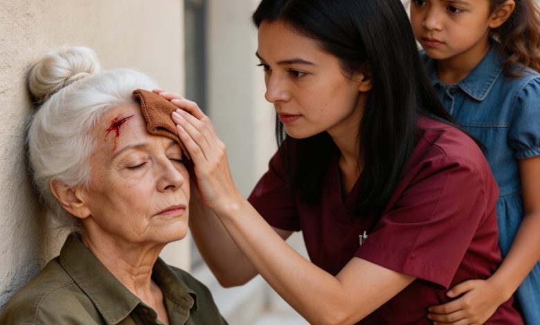 A young woman in a blue nurse’s uniform was kneeling beside her, moving with the precision of someone trained for emergencies. A small girl—clearly her daughter—clutched to her, whispering something in her ear.