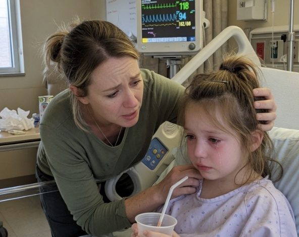 Lucy was sitting upright on the bed, clutching a paper cup in both hands as if it might disappear. Her cheeks were flushed, her hair damp at the temples. Her eyes— those enormous brown eyes that normally looked mischievous and warm— were too wide, too fixed.